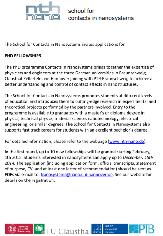 http://www.nth-nano.de/fileadmin ... CinN_first_call.pdf The School for Contacts in Nanosystems invites applications for PHD FELLOWSHIPS The PhD programme Contacts in Nanosystems brings together the expertise of physicists and engineers at the three German universities in Braunschweig, Clausthal-Zellerfeld and Hannover joining with PTB Braunschweig to achieve a better understanding and control of contact effects in nanostructures. The School for Contacts in Nanosystems promotes students at different levels of education and introduces them to cutting-edge research in experimental and theoretical projects performed by the partners involved. Entry to the programme is available to graduates with a master's or diploma degree in physics, technical physics, material science, nanotechnology, electrical engineering, or similar degrees. The School for Contacts in Nanosystems also supports fast track careers for students with an excellent bachelor's degree. For detailed information, please refer to the webpage (www.nth-nano.de). In the first round, up to 10 new fellowships will be granted starting February, 1th 2015. Students interested in nanosystems can apply up to December, 15th 2014. The application (including application form, official transcripts, statement of purpose, CV, and at least one letter of recommendation) should be sent as PDFs via e-mail to: Nanosystems@nano.uni-hannover.de. See our website for details on the registration. http://www.nth-nano.de One of the major problems in the use of nanotechnology is the connection of nanostructures with the macroscopic world. Topic of the PhD programme "Contacts in Nanosystems: Interactions, Control and Quantum Dynamics" is therefore the control of the contact to nanosystems. The contact is understood here not only as an electrical contact between two conductors, but in the more general sense as the coupling and interaction between the two systems, which can be of different dimension. Coupling effects can be purely electrical in nature and be caused by the Coulomb interaction, but can also involve the spin of the charge carriers, or also include the coupling to plasmonic excitations. The focus of investigations is on interaction effects and studies of control and quantum dynamics in particular of quantum dots and nanowires. These systems are studied experimentally and theoretically in terms of their electrical, magnetic, optical, thermal and mechanical properties. The working groups of the PhD programme have access to a broad material base. Particularly with regard to III-V semiconductor heterostructure systems, the groups are excellently equipped. So there is in Braunschweig a focus for GaN epitaxy and also in Clausthal GaN epitaxy is operated and studied, while in Hannover, at the PTB and also in Clausthal GaAs / AlGaAs / InAs systems are grown and investigated. However, novel material systems, such as topological insulators and the unique material graphene are also used since a number of similarities and synergies of these material systems exist with III-V - semiconductor systems. In addition to pure basic research, the PhD theses work on application aspects in particular. The research projects allow a deep understanding of the contact phenomena, so that systems can be designed and constructed with new functionalities in application fields such as sensor technology, energy technology, communication technology, but also medical technology. A list of possible PhD projects we offer at the moment. Click on the project ID or title to get an abstract of the project. Applicants should refer to these projects with the project ID in their apllication. http://www.nth-nano.de/offeredphd-projects.html Project ID Main Supervisor Co- Supervisor Location Title P1 Brenig Braunschweig Real time dynamics of energy and spin currents in finite quantum magnets P2 Daum Waag Clausthal Electrochemical nanocontacts of semiconductors: surface corrosion and corrosion inhibition P3 Frahm Recher Hannover Non-Abelian quasi-particles in electronic systems P4 Hangleiter Haug Braunschweig Realization and properties of III-nitride resonant tunneling structures P5 Haug Zwicknagl Hannover Transport through quantum dot systems in the Kondo regime P6 Haug Recher Hannover Transport through graphene nanostructures P7 Jeckelmann Hannover Electronic correlations and quantum dynamics in ultrathin nanowires P8 Lemmens Haug, Oestreich, Recher Braunschweig Effect of quantum well states on topological insulators and other spin orbit coupling dominated systems P9 Oestreich Hannover Interaction of few-spin systems with their environment P10 Pfnür Daum Hannover Nanoplasmonics with low-dimensional plasmons P11 Pfnür Daum Hannover Contacting single molecules with and without optical excitation P12 Recher Braunschweig Detection of exotic excitations in topological insulators and superconductors P13 Schaadt Lemmens Clausthal Plasmon coupling for efficiency enhancement in energy harvesting P14 Schaadt Oestreich Clausthal Spin dynamics in Cu-doped group III-nitride P15 Schumacher Braunschweig Dynamics of thermal spin torques in magnetic tunnel contacts P16 Waag Daum Braunschweig Contacts to Nanowire LEDs and other optoelectronic devices P17 Zwicknagl Haug Braunschweig Renormalized Perturbation Theory (RPT) and transport through quantum dots in the Kondo regime http://www.nth-nano.de/fileadmin ... CinN_first_call.pdf nth-nano.gif |
