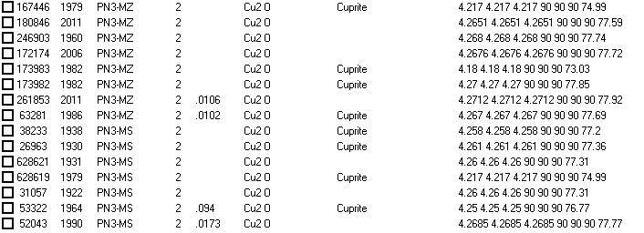 是不是这样子的,个人认为,就像ICSD里面的一样,不止一个人做了这个物质,所以,里面同一晶体,好多结构,就像我给你截得的图,那么多都是同一个东西,其实结构都是一样的,但作者不同。粉末也是吧。你之前做的氧化亚铜的标准卡片和这个的卡片一起导出,用ORIGIN导出对比一下,看看主峰能否对的上。你不要只看一个峰,整体比较一下。如果是俩的话,说明是有两个相的。我给你搜的是晶体数据库,有些物质,可能得不到晶体,只能得到粉末,所以粉末卡片里有,晶体数据库里没有。 写法不一样,是因为不同的人习惯不一样,有些就是会标上化合价,有的就不会。这个没什么影响,那个+1就是说是铜的化合价是+1价,这是毋庸置疑的。 |