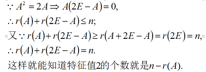 A为n阶实对称阵,A^2=2A, 且R(A)小于n,. 求A的特征值,,计算E-A的行列式值。。。。答案几乎是显然而知,但是对称阵这条件怎么用的?能推出A只有0特征值?. 还是这条件是坑爹迷惑人?. 求解 [ 发自手机版 http://muchong.com/3g ] |