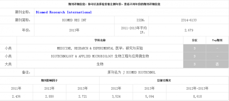 | 求Biomed Research International的最新分区情况,跪求 ,谢谢! |