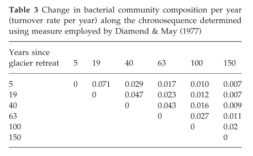 请问如何在已经得到个样本间turnover rate(βw)的基础上,将演替时间考虑进去,计算年平均的turnover rate?例如像是Bacterial diversity in a glacier foreland of the high Arctic中提到的table3,有没有人可以提供一下公式或是方法,不胜感激。 Table3 |