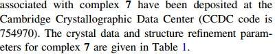 754970). The crystal data and structure refinement parameters for complex7are given in Table1.