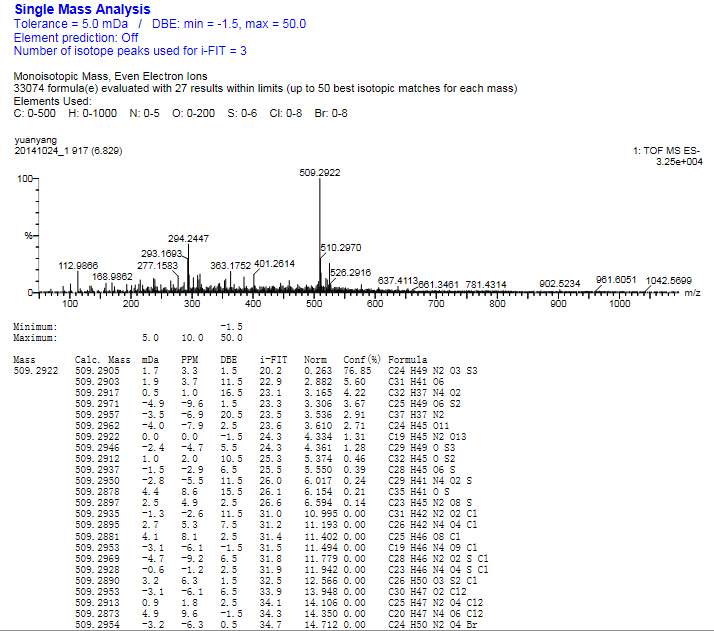 我最近也在做产物的分析,所用的仪器是UPLC-QTOF/MS(超快速液相色谱/高分辨质谱联用),离子源是EIS负离子源(原物质的分子质量=测出的质荷比+1)。你的应该也是用这个仪器测的。 结果的分析是利用MassLynx软件进行分析,得出的分析结果如你上图所示。质谱图--分析某个质量数的分子组成。 主要看实验m/z,理论m/z,质量偏差(ppm), 不饱和度(DBE),匹配度(conf%)、分子式。 1.分子式的选择:结合质量偏差(最好小于5ppm)和匹配度(越大越好)判断,再结合你掌握的文献报道的分子式选择最可能的分子式。 2.分子结构的推断:看相关文献是否有与你测出的相同质荷比的物质,得出结构式;或者相关文献报道的质荷比与你测出的质荷比相近的物质,根据反应机理(比如加成、取代反应等)推断可能的结构式。 个人理解:UPLC-QTOF/MS能够确定质荷比和分子式,但是结构式要根据文献报道来推导。 如果要准确地推出结构式,可以再接二级质谱(UPLC-QTOF/MS/MS)或者做GC-MS(有图谱库,直接匹配得出结构式)。 |