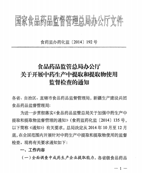 2014.10.29CFDA开展中药生产中提取和提取物使用监督检查的通知食药监办药