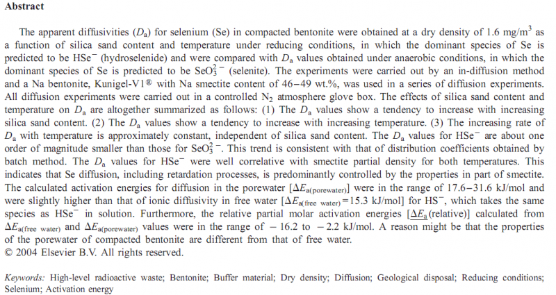 The apparent diffusivities (Da) for selenium (Se) in compacted bentonite were obtained at a dry density of 1.6 mg/m3 as a function of silica sand content and temperature under reducing conditions, in which the dominant species of Se is predicted to be HSe (hydroselenide) and were compared with Da values obtained under anaerobic conditions, in which the dominant species of Se is predicted to be SeO32- (selenite). The experiments were carried out by an in-diffusion method and a Na bentonite, Kunigel-V1R with Na smectite content of 46–49 wt.%, was used in a series of diffusion experiments. All diffusion experiments were carried out in a controlled N2 atmosphere glove box. The effects of silica sand content and temperature on Da are altogether summarized as follows: (1) The Da values show a tendency to increase with increasing silica sand content. (2) The Da values show a tendency to increase with increasing temperature. (3) The increasing rate of Da with temperature is approximately constant, independent of silica sand content. The Da values for HSe are about one order of magnitude smaller than those for SeO32- . This trend is consistent with that of distribution coefficients obtained by batch method. The Da values for HSe were well correlative with smectite partial density for both temperatures. This indicates that Se diffusion, including retardation processes, is predominantly controlled by the properties in part of smectite. The calculated activation energies for diffusion in the porewater [DEa(porewater)] were in the range of 17.6–31.6 kJ/mol and were slightly higher than that of ionic diffusivity in free water [DEa(free water) = 15.3 kJ/mol] for HS, which takes the same species as HSe in solution. Furthermore, the relative partial molar activation energies [DEa (relative)] calculated from DEa(free water) and DEa(porewater) values were in the range of 16.2 to 2.2 kJ/mol. A reason might be that the properties of the porewater of compacted bentonite are different from that of free water.