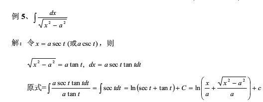 肯定不对!常数和被积变量是不能够互换的。 实际上,对于不定积分Integral{sqrt(x^2-a^2)*dx},令x=a/Cost, 并且假设:0≤t≤π/2,a>0,则有: Integral{sqrt(x^2-a^2)*dx} =Integral{sqrt(a^2/[Cost]^2-a^2)*a*Sint/[Cost]^2*dt} =Integral{a*tgt*a*Sint/[Cost]^2*dt} =a^2*Integral{[Sint]^2/[Cost]^3*dt} 再令u=tg(t/2), 则t=2*Arctgu,dt=2*du/(1+u^2) 故Sint=2*tg(t/2)*[Cos(t/2)]^2=2*u*1/(1+u^2)=2*u/(1+u^2) Cost=2*[Cos(t/2)]^2-1=2/(1+u^2)-1=(1-u^2)/(1+u^2) 将这些代入前式,得到: Integral{[Sint]^2/[Cost]^3*dt} =Integral{[4*u^2*(1-u^2)^3/[1+u^2]]^5*2*du/(1+u^2)} =8*Integral{[u^2*(1-u^2)^3*du/[1+u^2]]^6} 这是一个有理分式的积分,这个是已经解决了的问题,具体参见任意一本高等数学教科书。 |