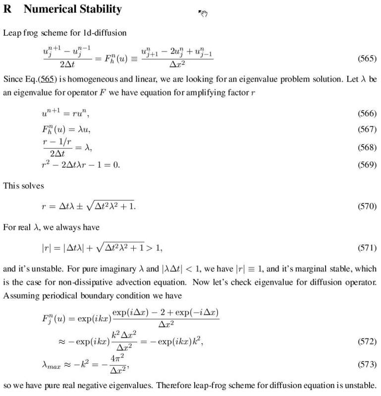 好吧,你想从收敛的定义来而不是Lax equivalence theorem 判断此格式不收敛。 不去咬文嚼字,收敛性的定义大致就是离散解uh逼近精确解u,当dt和tdx趋于零时。 我们知道原始解析方程的精确解一定是有界的,因为diffusion operator F 的所有的特征值都是纯实数小于零。事实上,对于一类边界条件,u最终会变成一条直线,这里就不详细证明了。可是,leap-frog scheme 的离散特征值lambda显然有大于零的实部,因为我们在楼上实际上是证明了 r = exp (lambda dt) 的绝对值大于零,也就是lambda有大于零的实部。那么就是说,uh(t) 会指数增长; 从而不会收敛到一个有界的精确解u(t)。这就证明了uh(t)是不收敛的。线性数值稳定性分析无非就是看离散谱点如何近似于精确谱点。 事实上,Lax equivalence theorem 有相当的建设性。因为,如果证明了不稳定性,也就是知道不稳定的数值特征值(很多线性稳定性分析都是直接找到增长的离散谱点)。增长率就决定了发散的速率。所以知道不稳定,就知道不收敛的方式,包括空间震荡(特征函数)的具体形式。不知道这是你不是你说的“收敛性的详细过程”。 |