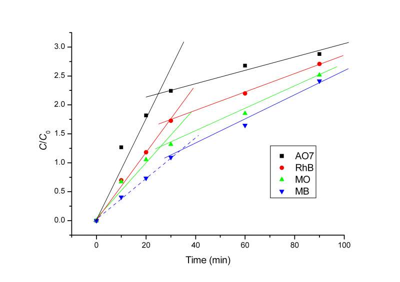 下图是我做的光催化实验的动力学曲线,似乎可以把它看成两个阶段,之前在那见过有类似的文章报道过,可是现在找了好久没找到,特在此求助,希望有看到过这样的曲线的文章能分享一下。谢谢
