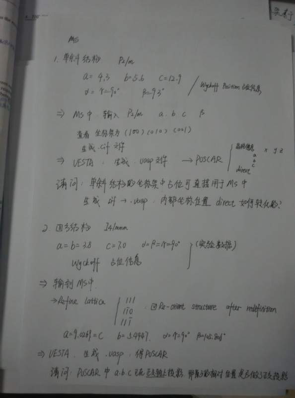 您好 我想请教您两个关于MS 构建晶体结构以及适用到VASP的问题。 即:对于单斜结构而言,实验中得到的晶格常数和Wychoff占位信息是否可以直接作为输入参数,输入到MS中,然后输出的 .cif 文件是否已经转化为VASP内 ...