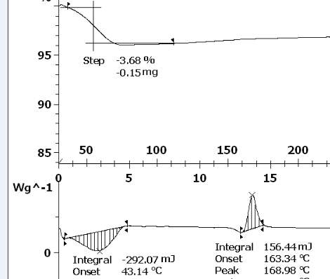 各位虫友:大家好,请大家帮我分析一下我的这个TGA-DSC图谱含有结晶水还是吸附水?怎么判断?还有从这个图上可以看到在30-80℃一直在失重,而我的样品是在50°真空干燥过的,怎么在30°时就开始失重了呢。另外,失重范围下方对应着的吸热峰比较明显,这是不是说明水份是结晶水??谢谢!!! 21.jpg |