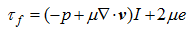 I是指单位矩阵。 这个公式的意思是应力张量由两个部分组成,压力项和粘性项。粘性项又包含两个部分,一部分是流体膨胀时产生的,另一部分是剪切应力。对于不可压缩流体,速度散度为零,公式右边第二项可省略。 公式有两个错误。 1,方程右边第二项的粘度不对,应该乘以系数(-2/3). 2. 这里e不是应力张量,是应变张量(strain tensor)。 |