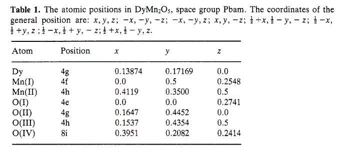 从附件的文献里,相信你能得到答案! GdMn2O5 Crystal Structure General Information Phase Label(s): GdMn2O5 Structure Class(s): – Classification by Property(s): intermediate valence Mineral Name(s): – Pearson Symbol: oP32 Space Group: 55 Phase Prototype: DyMn2O5 1. Crystal Structure of Paramagnetic DyMn2O5 at 298°K S. C. Abrahams1 and J. L. Bernstein1 J. Chem. Phys. 46, 3776 (1967) 2. C Vecchini et al 2014 J. Phys.: Conf. Ser. 519 012004 doi:10.1088/1742-6596/519/1/012004 Magnetic phase diagram and ordered ground state of GdMn2O5 multiferroic studied by x-ray magnetic scattering C Vecchini1,2, A Bombardi1, L C Chapon3,4, N Lee5, P G Radaelli6 and S-W Cheong5 3. C Wilkinson et al 1981 J. Phys. C: Solid State Phys. 14 1671 doi:10.1088/0022-3719/14/11/027 The antiferromagnetic structure of DyMn2O5 at 4.2K C Wilkinson, F Sinclair, P Gardner, J B Forsyth and B M R Wanklyn |