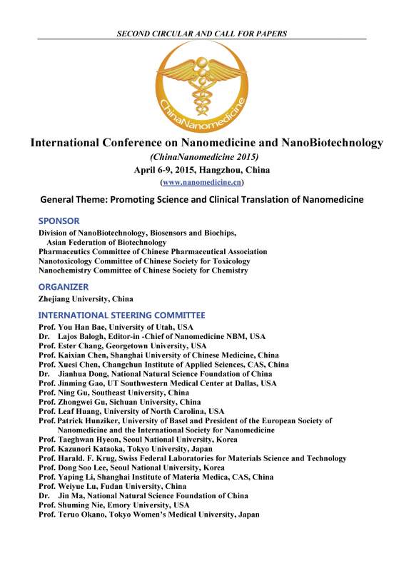 Introduction The International Conference on Nanomedicine and Nanobiotechnology (ChinaNanomedicine 2015) will be held at the Jinxi Hotel, Hangzhou, China on April 6-9, 2015. The general theme of the conference is To Promote Science and Clinical Translation of Nanomedicine by insight and multi-disciplinary discussion of innovative functional materials for cutting-edge nanomedicine with novel capabilities and the challenges in clinical translation. Leading academic, clinical and industrial scientists and experts from China, North America, Europe and Asia will participate in the conference. A diverse technical program is planned with inspiring thought leaders. Topics The main topics (but not limited to): Innovative nanomaterials for nanomedicines Nanomedicine for therapy Nanobiosensors and biochips Translational and personalized nanomedicines Nanomedical chemistry and toxicology COLLABORATING JOURNAL Nanomedicine: Nanotechnology, Biology and Medicine (Sci-indexed IF:5.98) will publish the selected full papers in a special issue and the accepted abstracts as a supplementary issue (SCI-indexed). 2nd CIRCULAR AND CALL FOR PAPERS.pdf 会议时间 2015-04-06至2015-04-09 会议地点 浙江杭州 主办单位 亚洲生物技术联盟,中国药学会,中国化学会,中国毒理学会, 联系人 唐建斌 电话 86-571-87953925 Email nanomedicine@zju.edu.cn 会议规模 100人以上 官方网址 http://www.nanomedicine.cn 20141202153447365.jpg 2nd CIRCULAR AND CALL FOR PAPERS_页面_1.jpg [ Last edited by Paulwolf on 2014-12-26 at 09:37 ] |