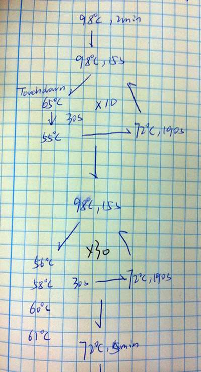 touch down 尝试过从70℃到55℃,和梯度温度在56℃和62℃之间,最近一次反应体系如下图: