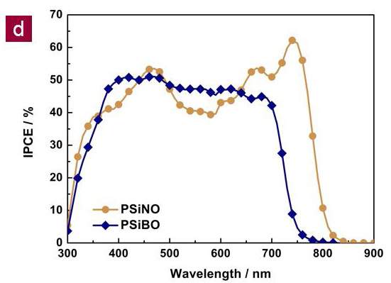 The IPCE spectrum of PSiNO is well matched with the absorption spectrum. However, the IPCE spectrum of PSiBO looks not matched with the absorption spectrum. Obviously, the polymer peaks shown in 600 nm ~ 700 nm range are quite dominant in the absorption spectrum of 1:1 PSiBO: PC71BM film (Fig S8 (b)). However, the polymer peaks shown in 600 nm ~ 700 nm range are significantly suppressed in IPCE spectrum.