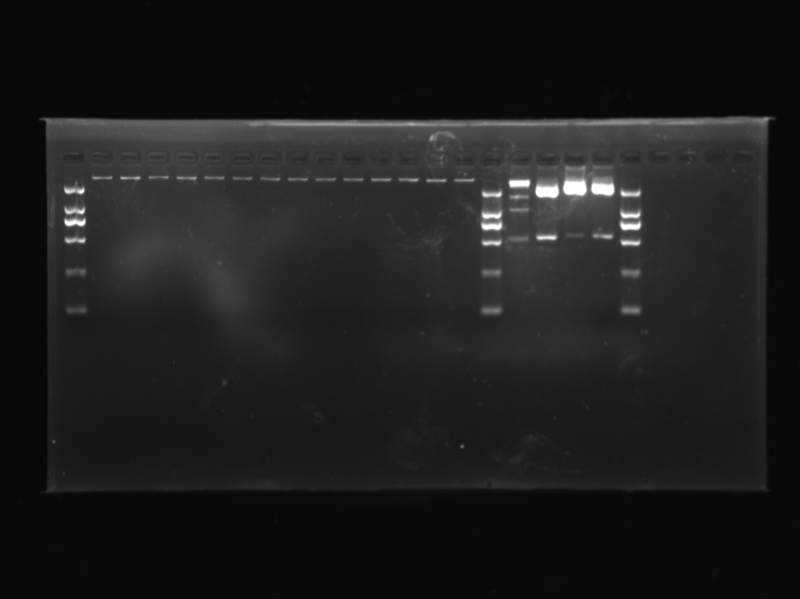 BI121 SmalI单酶切;3:PBI121 XbalI单酶切;4-13都是PBI121 的SmalI和XbalI双酶切;14:PBI121 XbalI单酶切;15:PBI121 SmalI单酶切;16:2Kmarker,17:15k Maker;18-20都是我目的基因的SmalI和XbalI的双酶切,目的基因大小为513bp。21:2Kmarker.昨天做的时候忘记点质粒了,所以可能缺少个对照,一会就去做,另外我目的基因没有做单酶切。15K marker跑剩4条带了。