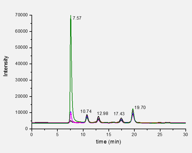 利用水浴提取不同处理组样品中可溶性糖。利用高效液相色谱仪对可溶性糖进行分析(如图)。 发现不同处理组之间的差异主要体现在7.57 min,但现在只知道10.74 min为纤维二糖,后面的峰为各种单糖,只能初步推测7.57 min的为低聚糖,那么问题来了,怎么通过分析技术确定这种低聚糖的种类呢(比如是四糖还是五糖等),请求各位战友指导下,谢谢。 液相.png |