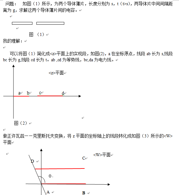 欲求并排放置的两个不等长度的薄带电容,如下图所示,经过相关文献查阅,在数理方法中的许瓦兹——克里斯托夫变换一节有对对称长度的薄带电容的求解,但是本人多天研究,仍然无法根据它来解除不等长度的电容问题,特来寻求高手相助,下图附上了我的问题的阐述以及我自己求解一半的过程,再往下无法进行了,。。。。希望多多指教。。。。 图像 1.png |
