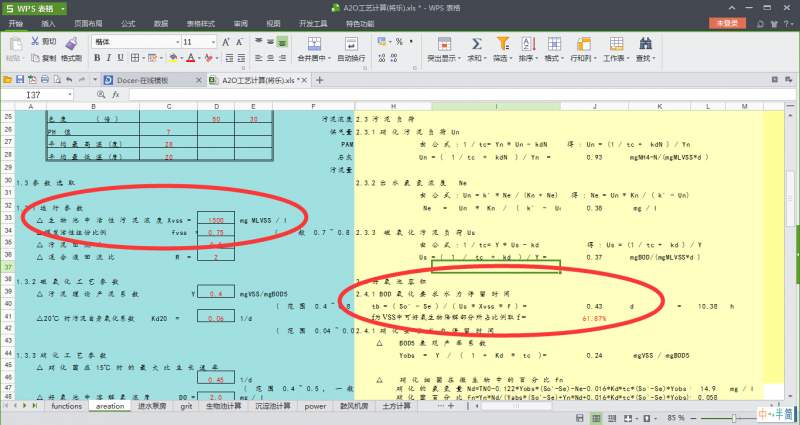 验算污水厂的工艺运行参数,不知道有人用过 <A2O工艺计算(设计).excel>没? ①能否解释下 D33 Xvss=??mg MLVSS/L 中,是输入实际测得的MLVSS 么? ②J40 BOD氧化水力停留时间是什么?因为其中也涉及到了D33 Vxss,网上百度不到这个概念。 特此请教。 计算书.jpg |