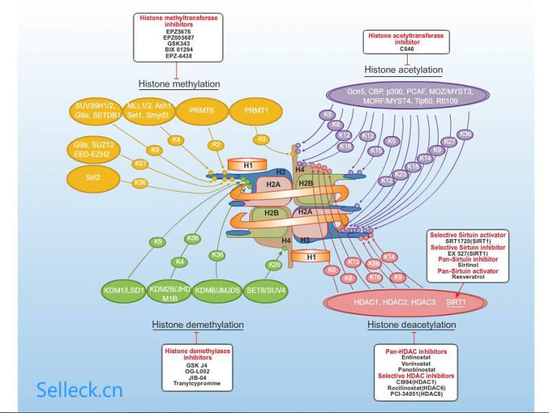 一、 MIL1蛋白简介 组蛋白甲基转移酶MLL1因其基因易位重排所引起的混合系白血病(mixed lineage leu- kemia)而得名。MLL1蛋白在基因调控、细胞增殖、生长分化等 生理功能中发挥着重要作用, 染色体易位重排所产生的MLL1融合蛋白则与急性白血病的发生发展密切相关。目前人们对MLL1 蛋白的结构和功能研究取得了很大的进展, 为以MLL1和其相互作用蛋白为靶点的新型MLL白血 病药物设计奠定了坚实的基础。 MLL1的多功能发挥和它复杂的结构息息相关。MLL基因全长约为89 Kb, 由37个外显子组成, 这些外显子在着丝点至端粒方向上被转录, 该基因能编码一个由3 969个氨基酸组成的多结构域蛋白[28]。前体MLL1蛋白合成后, 在第2 666/2 667个氨基酸残基(CS1)和第2 718/2 719(CS2)处被taspase1切断, 产生N端和C端两个多肽, MLL1N和MLL1C两者相互结合而形成一个完整的活性蛋白。 二、 信号通路图 三、 抑制剂MM-102 MM-102是一个具有高亲和性的多肽模拟类的MLL1抑制剂,其IC50为0.4 μM。MM-102,作为MLL1的模拟肽,展现了与WDR5的高亲和性,相应的IC50和Ki分别为2.9nM和<1nM。在转染了MLL1-AF9的鼠源细胞中,MM-102特异性的降低了两个重要的MLL1靶基因(HoxA9andMeis-1)的表达,这两个基因是MLL1介导的白血病形成所必须的。另外,MM-102高效并且选择性的抑制了含有MLL1融合蛋白的白血病细胞的生长,并且诱导了这些细胞的凋亡。 细胞实验:MV4;11,KOPN8和K562细胞培养在加入10%胎牛血清以及100 U/L青霉素和链霉素的RPMI 1640培养基中,温度37 °C5% CO2. 密度为5 × 105/每孔的1 mL细胞种在12孔板中,加入空白对照DMSO(0.2%)或者MM-102处理七天,每隔两天更换一次培养基和抑制剂。遵照生产商的说明使用发光法细胞活力检测试剂盒。首先,在每孔细胞中加入100 μL试验试剂,在回旋振荡器上混和2 min来诱导细胞分裂。室温孵育十分钟后,用酶标仪检测。 |