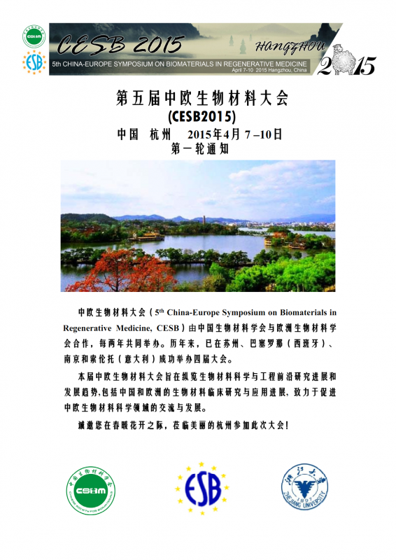 第五届中欧生物材料大会(CESB2015)中国 杭州 2015年4月 7 –10日第一轮通知