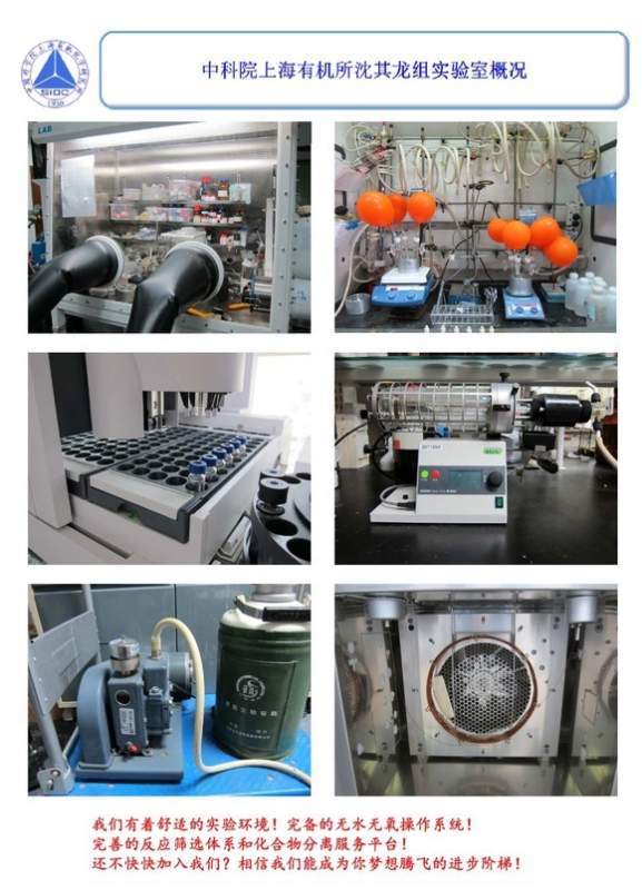 沈其龙课题组隶属于中科院上海有机化学研究所中科院有机氟化学重点实验室。主要研究方向包括: 1)过渡金属催化的新型三氟甲基化方法学的研究; 2)含氟氮、膦配体的合成,与过渡金属的配位及其在不对称催化反应中的应用的研究; 3)高选择性的芳香化合物的碳-氢键活化的方法学研究; 4)C-F键活化相关过渡金属催化偶联反应的研究; 5)具有应用前景的含氟物质及含氟功能材料的合成。 由于科研工作的需要,现招聘实习生数名。加入本课题的人员有望学习到配体和高活性金属有机化合物合成的方法,熟练掌握无水无氧操作及各种表征技术(尤其是核磁共振)。 应聘者请提供简历至:shenql@sioc.ac.cn PS 最近的文章发表情况: http://www.chemfeeds.com/cf-search.php?searching=Qilong+Shen PPS 未来将持续有博士后、职工的招聘信息,请关注所主页的招聘信息栏。www.sioc.ac.cn b_large_36wJ_2d49000010781263.jpg b_large_qgaq_712300002c511262.jpg b_large_CW5B_126f000004981262.jpg |