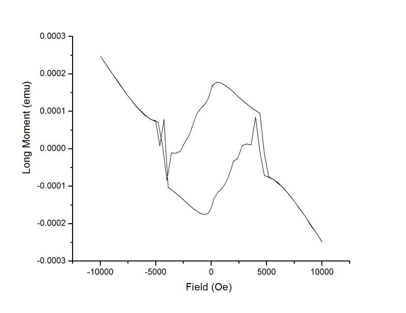 用SQUID测量得到的碳膜的磁滞回线-初始数据和扣除背景信号曲线如下图,请大家帮我分析一下,为什么曲线饱和了磁化强度又下降了,很奇怪。