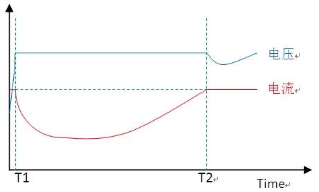 T1-T2:恒压阶段,电流变化呈下降---平稳---上升(正常电芯电流逐步减小)