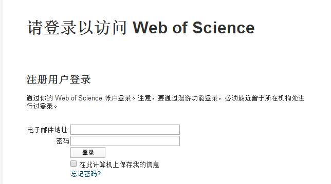 进入Web of Knowledge主页(http://www.webofknowledge.com/),会显示下图所示界面,之后输入电子邮件地址和密码,点“登录”即可登录进入使用Web of Science了 QQ截图20141215122407.jpg |