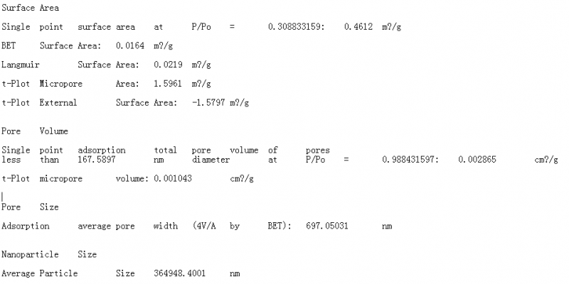 这个数据没意义,可能是漏气或者样品前处理没处理好。建议重新测试.要注意的主要有: 1,前处理温度和时间,要合理,一般耐高温材料,微孔的要求250度处理3--5小时,既然你的材料经过高温碳化,我想300度处理3小时差不多够了。介孔材料15--200处理3--5小时即可。非多孔材料100--200度处理2--4小时即可。时间可以长些。可以根据热重分析去合理取舍。前处理得作用是把孔内的杂质和水分,以及表面的杂质去除掉。 2,检测设备的准确性和气密性,以及气路中气体是否足够。 3,预估材料的比表面积,称样量保证,多些没关系。别太少,特别是比表面积小的,样品量尽量多些。 4,合理设定参数,很多设备测试的时候有很多种测试模型,要有针对性的选择,微孔材料选用微孔模型,介孔选用介孔模型。甚至有的模型还分碳基和硅基材料。 具体请看这个帖子http://muchong.com/bbs/viewthread.php?tid=8291378&pid=3#pid3 |