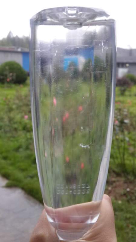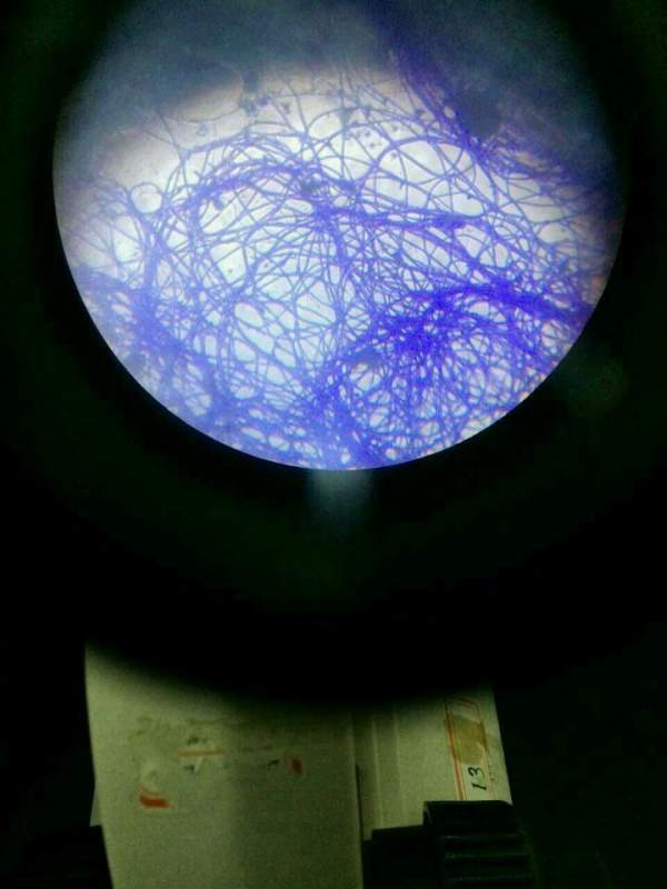 第一个图片是矿泉水瓶子中明显的有絮状沉淀,第二个图片是该沉淀染色后放大1000倍后