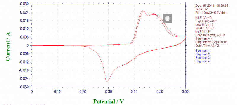 各位大侠,我在测试超电容的时候,怀疑数据不正确,就拿纯镍网(上面什么都没有)做了测试,电解液是3M KOH,参比电极是Hg/HgO。下面是CV曲线和充放电曲线。请问这是为什么?我测试的其他材料,Fe2O3的曲线也是相似的,这个氧化还原峰到底是镍网 的,还是我的材料的? %9UPH49){3KFI]@Z9E`@5)1.png (C7QW9F%Q}ZPL}P6OMJCO0Z.png |