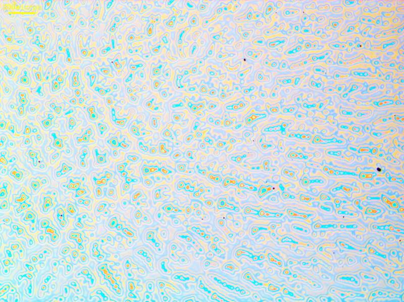 试过丙酮溶剂和四氢呋喃溶剂,浓度为5%,在硅片上旋涂,旋涂参数为1500rpm,30s,旋涂出来后表面呈透明状,但可以看到整个表面并不是平整的而是凹凸不平的,重新配过溶液,试过很多次都是这样,不知道是为什么?附件为显微镜照片。 1500rpm 5%.jpg |
