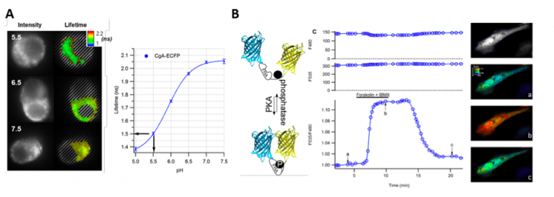 替老师发帖,女教授,法国人,非常漂亮,非常nice,从不生气 至少我们没有见过。我只负责帮老师传递消息,因为功课很紧张,可能没有时间回复。希望大家踊跃申请,直接联系老师即可。对法语没有要求,老师英文非常好。Laboratory name :Laboratoire de Chimie Physique Laboratory web site http://www.lcp.u-psud.fr/ PhD supervisor (contact person) Marie ERARD Associate Professor marie.erard@u-psud.fr [/email] +33 1 69 15 30 14 Specific requirements to apply, if any Applications containing a detailed CV, a description of previous research experience and interests and names of two references should be send by email Thesis proposal (max 1500 words) 1. State of the art and project Green fluorescent proteins (GFPs) have given rise to new powerful bioanalytical imaging techniques that are increasingly used in pharmacological and clinical research, as well as in environmental sciences and biotechnologies. In particular, FPs are widely used as genetically encoded biosensors to image and quantify biochemical activities in living cells. [1-4] They can be classified in three categories (For a complete review on FP based biosensors see [4]). The first one takes advantage of the intrinsic sensitivity of the FP’s photophysical property to a physico- chemical parameter or an ion concentration. For example, we recently exploit the pH sensitivity of the cyan ECFP to monitor the intragranular pH of secretory granules in chromaffin cells by fluorescence lifetime imaging or FLIM (Fig1A). [5,6] In the second category, the FP is fused with a sensor module. When the latter is modified by the binding of a metabolite or an enzymatic activity, its conformation changes and modulates the fluorescence of the nearby FP. The third and last group is based on Förster Resonant Energy Transfer or FRET between two FPs grafted around a sensing module whose conformation controls the FRET efficiency (Fig 1B). More than 60 % of FRET based biosensors use cyan and yellow variants. If in the first category, the calibrated responses of FPs may be used to monitor specific parameters, the other cases require FPs with fully controlled photophysical response to any changes in their environment in order to avoid any misinterpretation of the fluorescence signals. To achieve this goal, we recently genetically engineered a new bright cyan fluorescent protein variant mainly insensitive to its environment called Aquamarine. This FP  has a fluorescence quantum yield close to 90%, an impressive pH stability (pK1/2 = 3,3) and a near- single exponential fluorescence decay.[7-9] This result was obtained with only two single point mutations (65S and 148G) on the genuine ECFP. Aquamarine was introduced with a great success in a cAMP-dependant kinase sensor to produce an efficient FRET based biosensor (Fig1B).[7]  Figure 1. A. ECFP, a lifetime-based pH sensor.[5] (left) Intensity and FLIM images of chromaffin cells at three pH values. FLIM images were obtained on the chosen ROI after a 4x4 binning of the intensity image. Cell size ca 10 μm. (right) pH dependence of the fluorescence lifetime of CgA-ECFP in chromaffin cells (average ± SEM, N ranging from 10 to 40). Solid line corresponds to the best fit to a sigmoidal analytical model and is for eye guidance only. B. AqAKARCit biosensor response in BHK cells.[7] (left) Schematic representation of conformational reorganizations in AKAR probe upon phosphorylation by PKA. (middle) Evolution of fluorescence intensities of Aquamarine (F480) and Citrine (F535) upon Aquamarine excitation and of their ratio (F535/F480) versus time upon activation of PKA by Forskolin in presence of IBMX. (right) From top to bottom: intensity image of the cell and ROI used to calculate the average ratio plotted on the left, ratio images corresponding to the points a, b and c on the F535/F480 trace. Based on our previous work the aim of the project will be to (i) complete the improvements performed on Aquamarine by optimizing its resistance to photobleaching and/or (ii) develop new FRET based biosensors taking advantage of its amazing properties for calcium, reactive oxygen species or cAMP-dependant kinase activity. The detailed working plan of the PhD project will depend on the skills and the interests of the candidate. He/she will have either a strong background in molecular biology and biochemistry or a deep knowledge in photophysics and fluorescence spectroscopy. Some expertise in cell biology or optical microscopy will also be appreciated. In addition, the candidate should also show interest for working in a multidisciplinary atmosphere as the project will be performed in close collaboration with cell biologists (Pr. Oliver Nüsse at UPSud, Orsay, Dr. Pierre Vincent at UPMC, Paris or Dr. Catherine Berthomieu at CEA). References 1. De Michele R, Carimi F, Frommer WB (2014) Mitochondrial biosensors. International Journal of Biochemistry & Cell Biology 48:39-44. 2. Ohba Y, Fujioka Y, Nakada S, Tsuda M (2013) Fluorescent Protein-Based Biosensors and Their Clinical Applications. In: Fluorescence-Based Biosensors: From Concepts to Applications, 113:313-348. 3. Sipieter F, Vandame P, Spriet C, Leray A, Vincent P, Trinel D, Bodart JF, Riquet FB, Heliot L (2013) From FRET Imaging to Practical Methodology for Kinase Activity Sensing in Living Cells. In: Fluorescence-Based Biosensors: From Concepts to Applications, 113:145-216. 4. Newman RH, Fosbrink MD, Zhang J (2011) Genetically encodable fluorescent biosensors for tracking signaling dynamics in living cells. Chemical reviews 111 (5):3614-3666. 5. Poea-Guyon S, Pasquier H, Merola F, Morel N, Erard M (2013) The enhanced cyan fluorescent protein: a sensitive pH sensor for fluorescence lifetime imaging. Anal Bioanal Chem 405 (12):3983-3987 6. Poea-Guyon S, Rafet MA, Erard M, Amar M, Moreau AW, Fossier P, Gleize V, Vitale N, Morel N (2013) The V- ATPase membrane domain is a sensor of granular pH that controls the exocytotic 