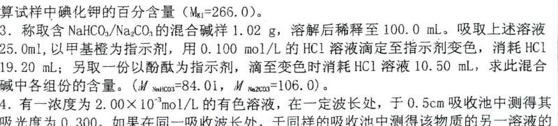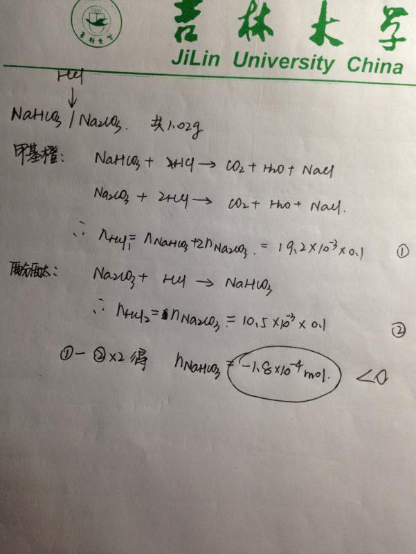 额,若要样品只有碳酸氢钠和碳酸钠的话。假设全是碳酸氢钠消耗的HCl体积为1.02/4/84.01/0.1*1000=30.35。能不能考虑不全是碳酸氢钠和碳酸钠的混合物。题目中间的分号后面是不是该理解为另取1.02g来滴定的…… 反正后面我是用另取1.02g来算的倒是得到个结果