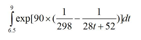 Integrate(exp(90*(1/298-1/(28*t+52))),t=6.5,9);
