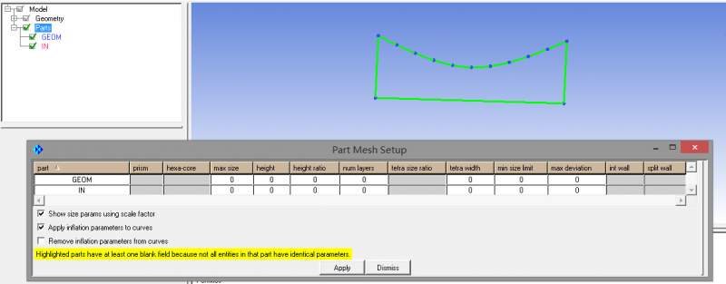 如图所示,在定义了入口边界in这个part后,对part上的网格尺寸进行定义,发现in这一part对应的 prism hexa-core等项都处于高亮状态无法勾选,对话框下有一串高亮英文:highlighted part have at least one blank field because not all entities in that part have identical parameters.