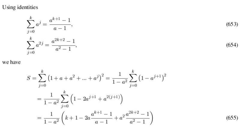 >> syms k >> symsum(a^k,k,0,k) ans = a^(k+1)/(a-1)-1/(a-1) >> factor(ans) ans = (a^(k+1)-1)/(a-1) >> symsum((a^(k+1)-1)/(a-1),k,0,k) ans = -(-a^(k+1)*a+(k+1)*a-k-1)/(a-1)^2-a/(a-1)^2 >> factor(ans) ans = -(-a^(k+1)*a+k*a+2*a-k-1)/(a-1)^2 |