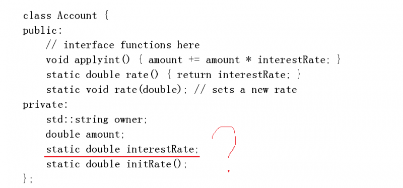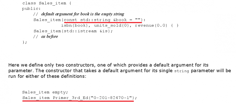 1、没有冲突啊,类里面的那个是声明,定义在类外面,应该是这样定义, double Account::interestRate = 一个double型数; 2、book只是个有默认参数的参数而已,使用的时候,还是看外面传来什么,构造函数也是一种函数,比如: 一个函数Test(const string& str = "" ;使用的时候,你可以这样使用Test(),相当于 string str = ""; Test(str);,只是这里使用了默认参数,不需要你写了, 你还可以这样使用,string str = "test"; Test(str); 这就不使用默认参数了,这两个过程就相当于你截图的那个例子,明白? |
