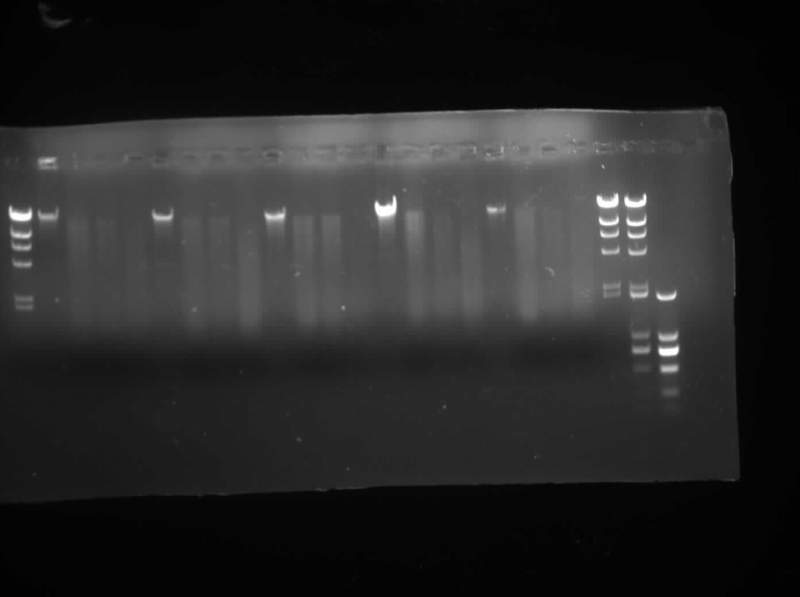 试了好几次,不同上样量,不同时间(3-12h)都做过,做完后都是这种弥散图。基因组使用宝生物的试剂盒提取的。lane1是maker;后面是4个细菌基因组的酶切图,共三种酶EcoR I,Hind 3,Sma I。 20141223s2w3y1y5b0meiqie.jpg |
