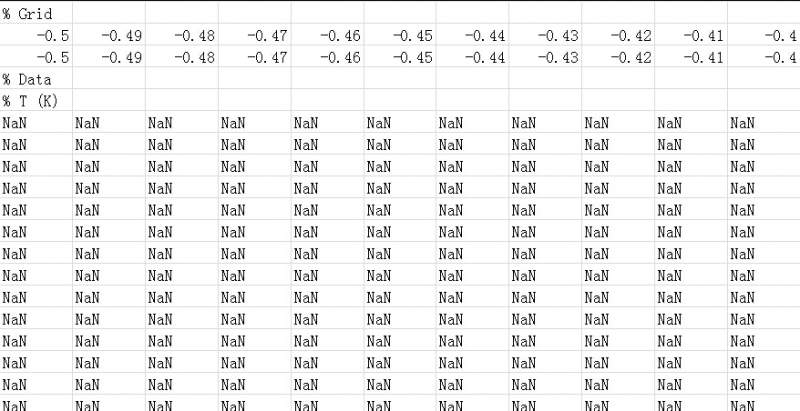 comsol软件导出数据时,使用格点导出,结果在导出的数据中坐标显示正常,但是温度量确是NaN。 我猜测是不是我导出的格点位置没有结果?有没有什么解决方法?谢谢各位大神了! NaN.jpg 格点.jpg |