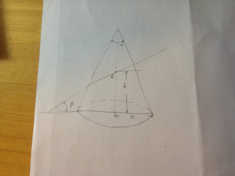 如图,一个底面半径为R,母线与对称轴夹角为阿尔法的圆锥被一个与水平面夹角为贝塔的平面截取,交对称轴于O,求所截面的周长 虽说想到了解析法。。。不过积分上遇到了困难,万望各位前辈不吝赐教。 PS,千万别用椭圆周长公式,光是证明截面是椭圆,想想就好麻烦2333 |