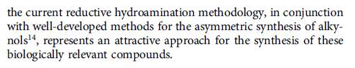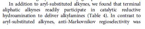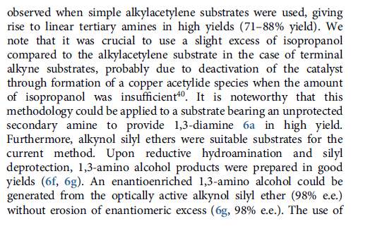 除了芳基取代的烷烃以外,我们发现端脂肪烷烃也容易发生催化还原氢胺化制得烷基胺(表4)。与芳基取代的烷烃相反,当仅仅使用烷基乙炔作为底物时就会出现反-Markovnikov区域选择性,生成高产率(71-88%)的线式叔胺。我们注意到,与制端脂肪烷烃时使用的烷基乙炔底物的量相比,使用稍微过量的异丙醇是至关重要的,可能是由于当异丙醇的量不足时催化剂会因形成乙炔铜物种而失活。值得注意的是,可以用这种方法将那些有不受保护的仲胺的底物制备得到高收率的1,3-二胺。此外,现有方法也适用于炔醇硅醚作为底物。一旦还原氢胺化和硅烷基去保护,1,3-氨基醇就可以从具有光学活性的炔醇硅醚(e.e.值98%)生成而不造成对映体过量(e.e.值98%)的损失。使用现有的还原氢胺化方法配合完善的非对称合成炔醇的方法,是合成这些生物相关的复合物的一种非常有吸引力的途径。