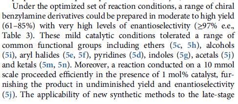 在优化的反应条件下,可以制得一系列中到高产率(61-85%)且对映选择性很高(如表示所示,e.e.值≥97%)的手性苄胺衍生物。这些温和的催化条件允许一系列的官能团的存在,包括酯、醇、卤代芳烃、吡啶、吲哚、乙酰及酮。此外,在1 mol%催化剂作用下10 mmol规模上的反应能够高效发生,反应后产物的产率和对映选择性丝毫不减。新的合成方法适用于对复杂天然产物的后续修饰是一个非常理想的性质,因为生物活性分子类似物无需从头合成就能够制备出来。因此,很容易从天然产物δ-维生素E和雌甾酮制得的烷烃经非对称还原氢胺化制得高产率且具有优异的催化剂控制非对映选择性的胺化产物(d.r.:99:1)。值得注意的是,在所有应用了芳基取代的烷烃发生的还原氢胺化反应中,胺化产物具有独特的Markovnikov区域选择性,C-N键形成发生在临近芳基的位置上。