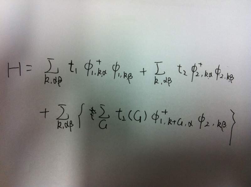 紧束缚近似后的哈密顿量见附图所示。主要的问题是,如何将这个哈密顿量写成矩阵表示,其中前两项还行,主要不太清楚怎么处理第三项。第三项中G的取值有两项,一个为0,另一个为-G0.希望能有高人指点,谢谢。 Hamilton.JPG |