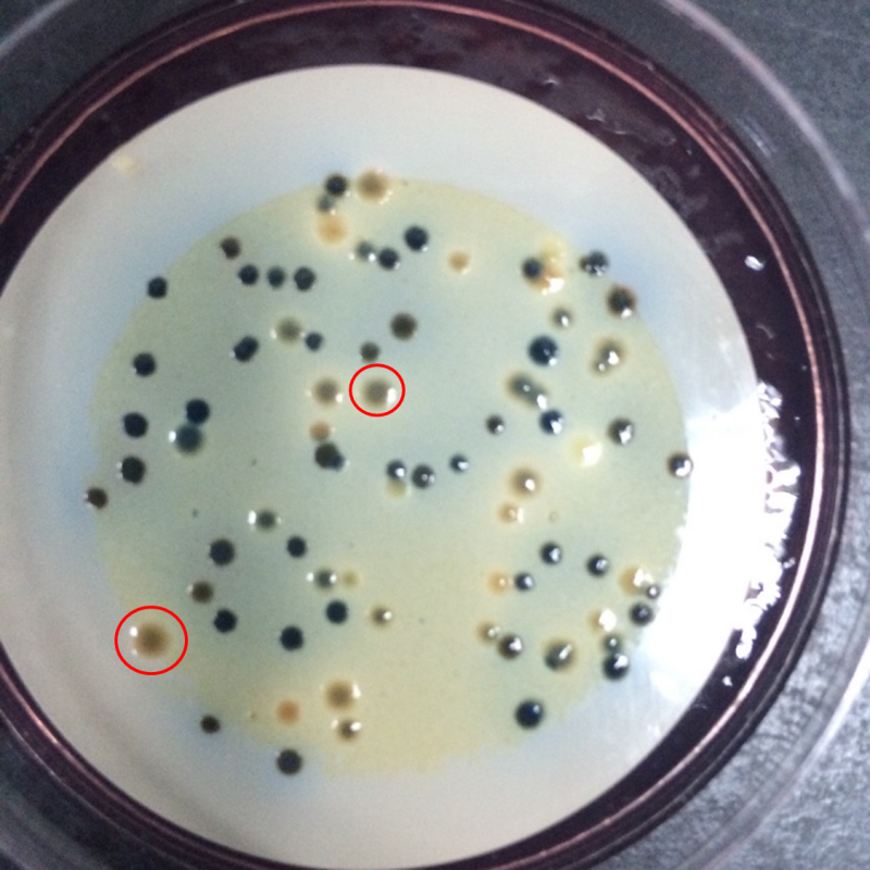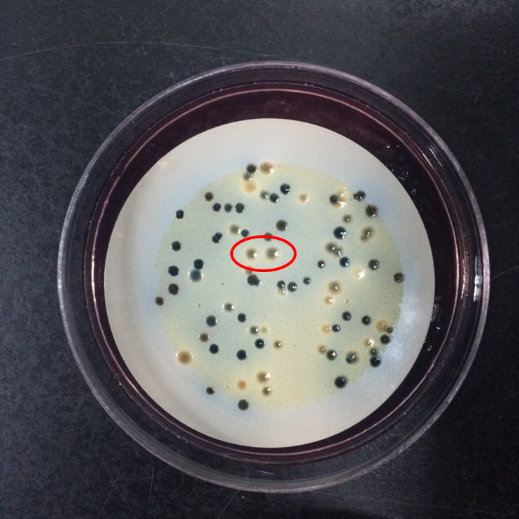 如图中红色圈出的,菌落内部隐约显示蓝色,外部有一层奶白色的膜包裹的菌落,似乎介于上述个标准之间。