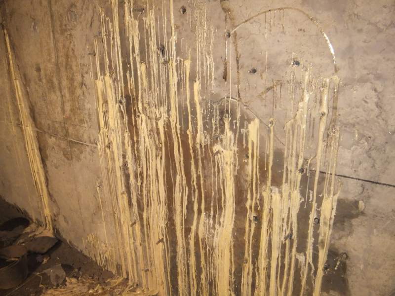 请教各位:混凝土裂缝用注浆的方法修复,注浆用的是写着IP-11聚氨酯堵漏剂,是以多氰氨酸和多羟基聚醚通过聚合反应生成的高分子化合物。问题是,用了这种材料堵漏后,混凝土表面也会有流动。固化后,粘在混凝土上,很难清除。所以问问各位,有没有什么办法,可以用化学的方法清除这种固化后的聚氨酯,或者隔离聚氨酯与混凝土表面的粘结?方法有效实际点就行。 混凝土表面附着聚氨酯泡沫.jpg |