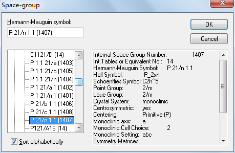 看晶胞参数里面不等于90度的那个角,如果是alpha角,说明二次轴选的是a方向,空间群应该选择P21/n 11(1407);如果是beta角,则选择P1 21/n 1(1401);如果是Gamma,则选择P11 21/n(1404)。