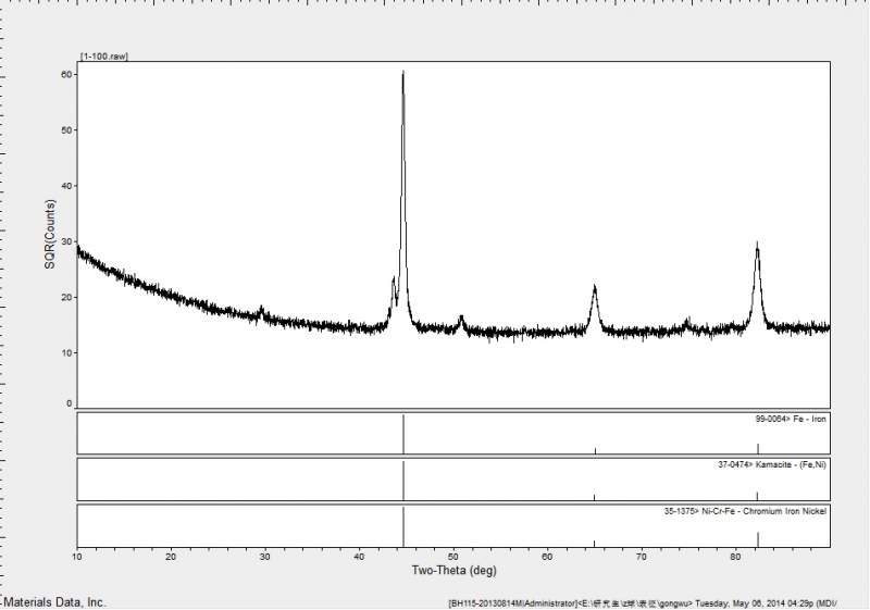 哎,我先说说吧,图下第一个横条显示是 体心立方的铁(普通的钢铁,不是奥氏体钢)。包括45 65 82度的三个峰。其他的小峰你要结合自己的材料特点看。