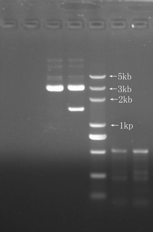 载体是PMD19连接了2.4kb的片段转到JM109里 康为的试剂盒提取的质粒 Mark左侧那两组是质粒 点样5uL 麻烦帮我看一下 1800bp左右那条带是怎么回事 3000多那条最亮的带 是环状超螺旋的质粒吗